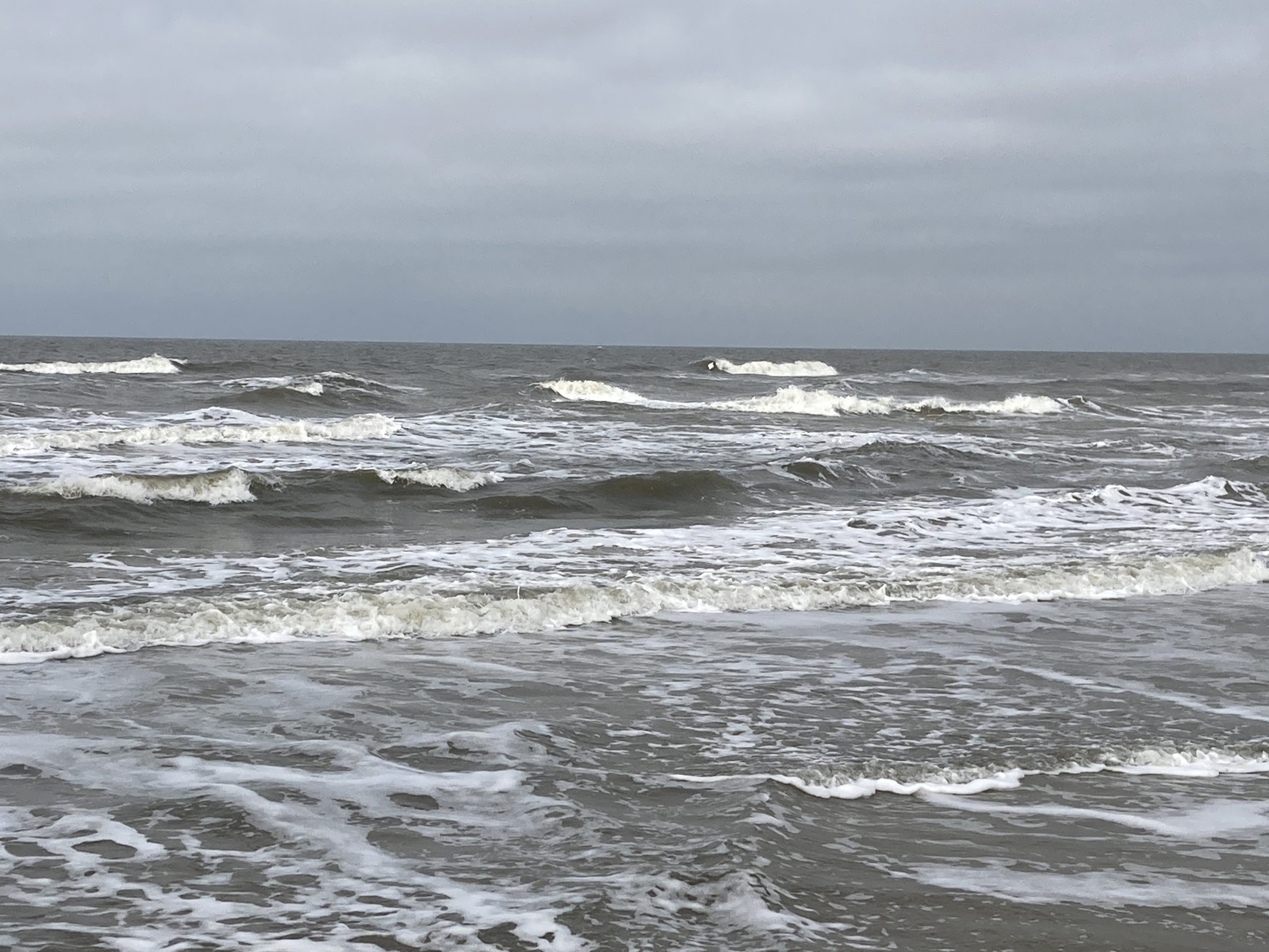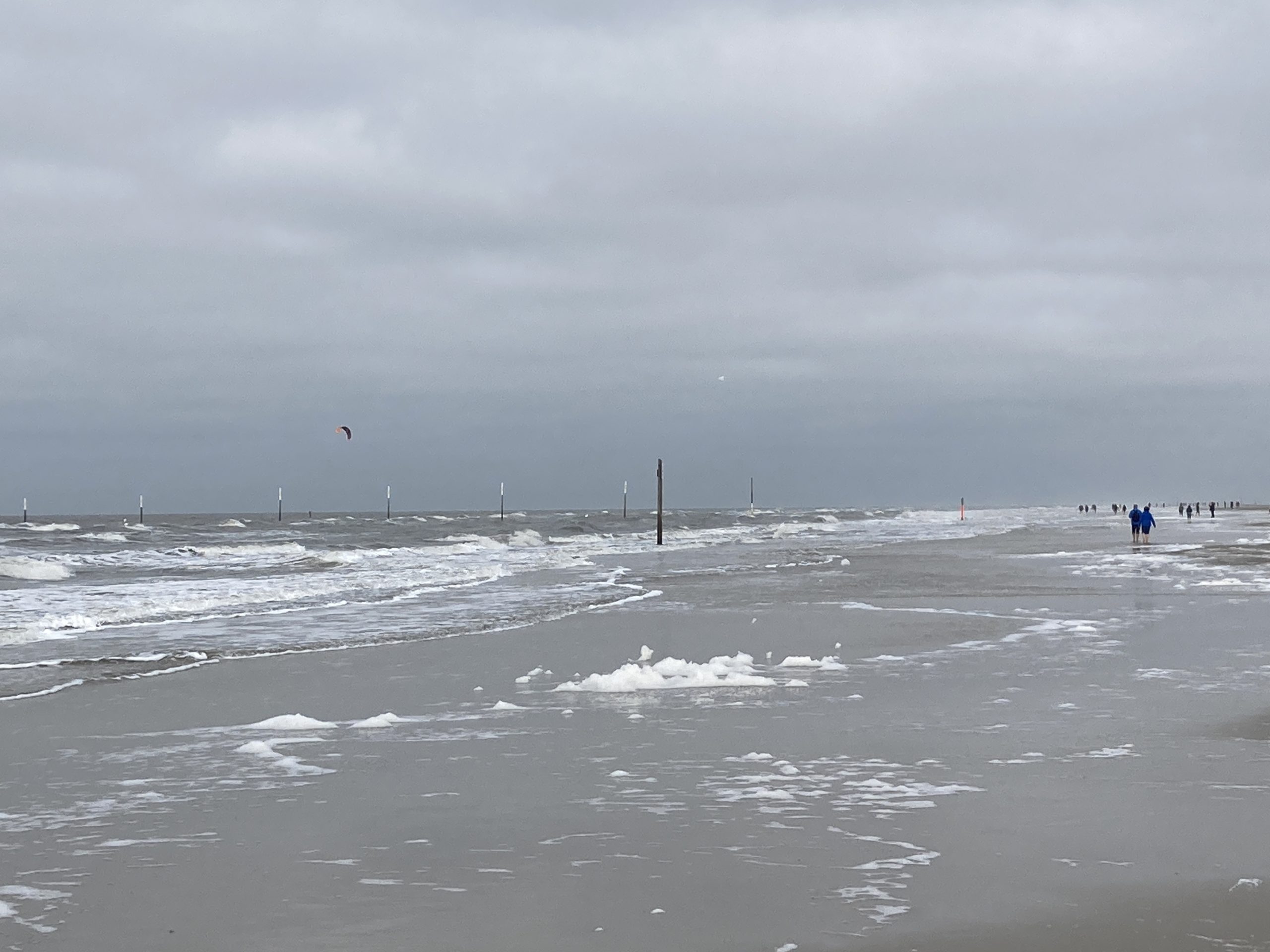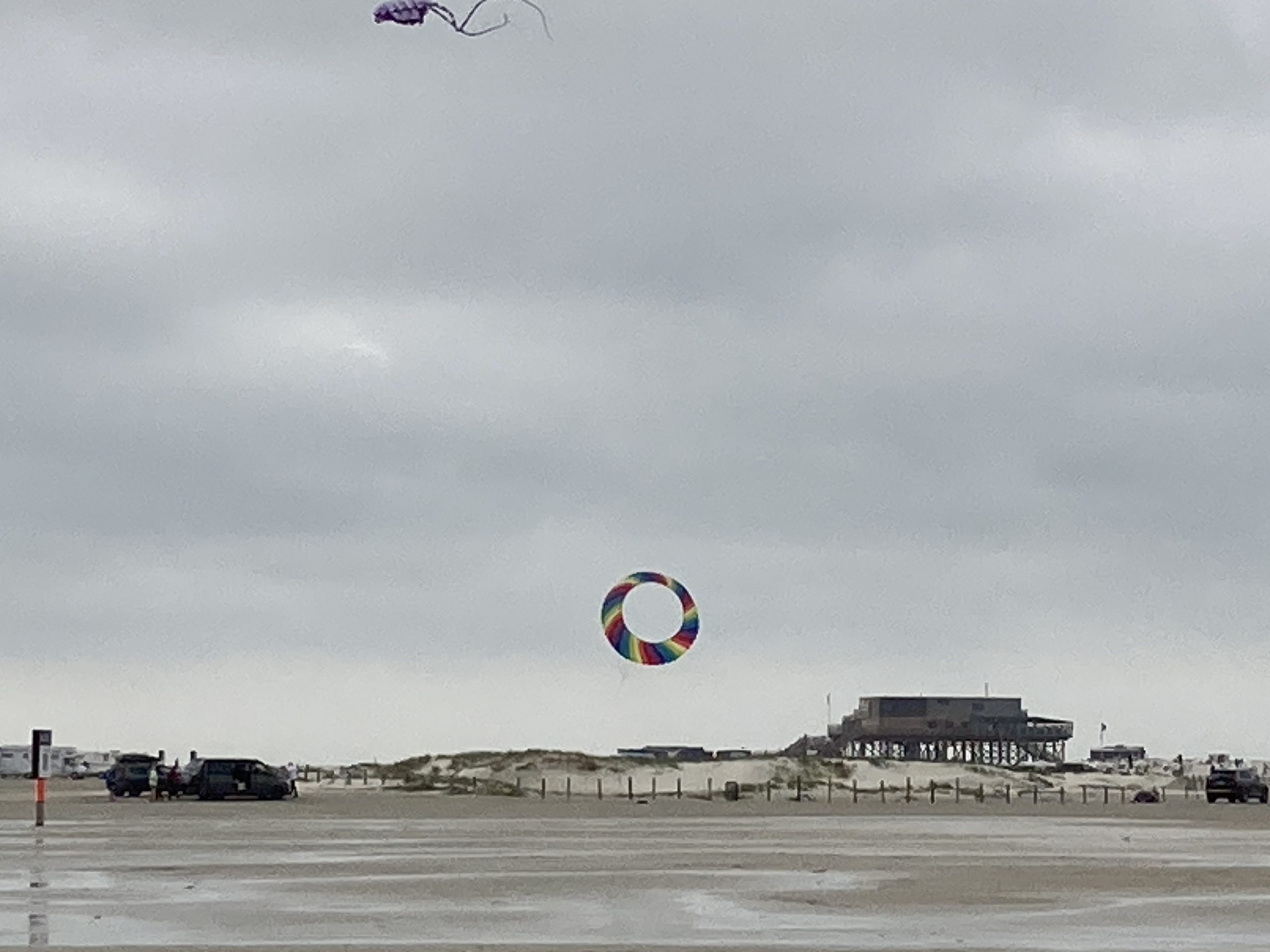 Jetzt wurde es aber Zeit: der Höchststand der Flut war da und da wollten wir eigentlich am Strand von St. Peter-Ording sein. Ich hatte gelesen, dass man in Ording mit dem Auto bis auf den Strand fahren darf. Kann man wirklich und viele tun es auch. Aber es kostet 15 Euro! Was okay ist, wenn man den ganzen Tag am Strand bleiben will, aber für mal kurz der Nordsee „Guten Tag“zu sagen, erschien es mir doch ein bisschen heavy. So parkten wir für 3 Euro vor dem Deich und bekamen dadurch ohne Problem unsere täglichen 5000 Schritte hin! Aber während gefühlt Tausende von Menschen dort begeistert unterwegs waren, war mir schon nach kürzester Zeit klar: Ich brauch´ das nicht! Ich brauch´ keine Wellen und Sand brauch´ ich schon doppelt nicht!!! Und mit Strandkörben – in die hätte man sich nämlich inzwischen kostenfrei rein setzen können – kann ich auch nichts anfangen, weil meistens sind sie sandig. Also begrüßten wir das Meer kurz. Es schien sowieso nicht besonders begeistert von unserem Anblick zu sein, es zog sich nämlich schon wieder zurück! Was wir dann auch umgehend machten. Und Kaffee hatten wir immer noch nicht! Und Hunger inzwischen auch!