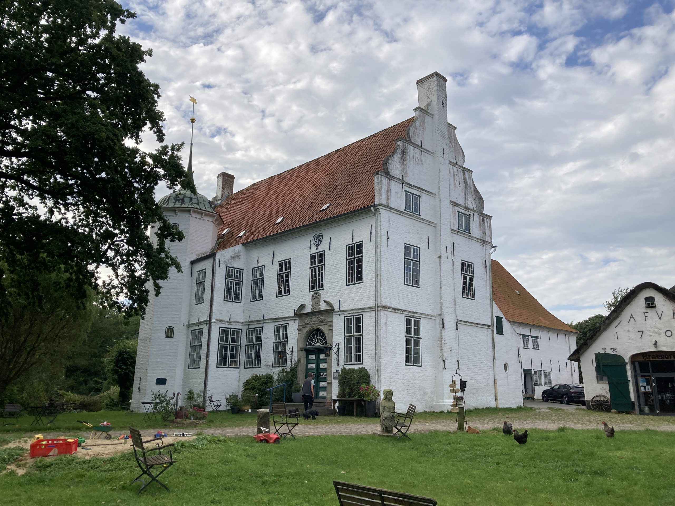 So fuhren wir weiter nach Tating. Dort sollte es einen hübschen Park geben, den Hohendorfer Garten. Das Wort Garten hätte uns schon warnen sollen: der Park war echt winzig und auch nur zu einem kleinen Teil angelegt, der Rest war einfach Wald. Aber siehe, da schimmert doch ein Haus durch die Bäume. Und bei näherem Hinsehen wurde uns klar: Ein Haubarg, eindeutig! Er war zwar wesentlich kleiner und in vier Ferienwohnungen aufgeteilt, aber es war noch ganz klar erkennbar, was es einst gewesen war. Jetzt war unser Interesse an Haubarge endgültig geweckt: Und siehe da, wenn man sie sucht, findet man sie überall. 40 – 50 soll es noch auf der Halbinsel geben. Einer stand sogar zum Verkauf, aber eine halbe Million für etwas, was mehr Ställe als Wohnfläche besitzt, war uns dann doch zu teuer. Außerdem war er auch wirklich schon ziemlich verfallen. Haubarge renovieren scheint etwas für reiche Leute zu sein. Im Hohendorfer Garten gibt es auch noch ein Schweitzerhaus (da wohnten früher die Angestellten drin), heute ist da ein Cafébe. Aber das Glück war uns wieder nicht hold: es machte erst um 12.00 Uhr auf.