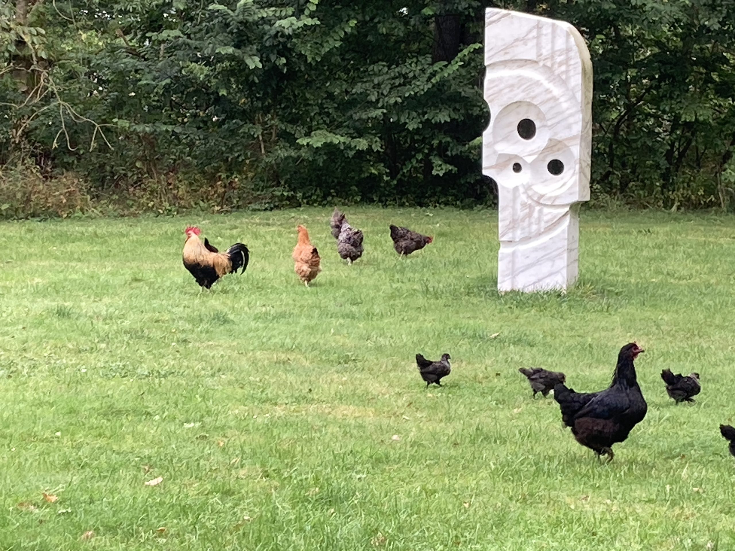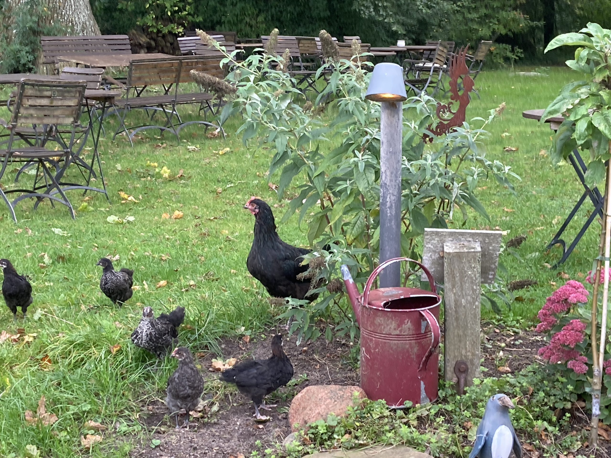 Noch einmal fuhren wir über unsere Halbinsel und machten dabei einen kurzen Stopp beim Herrenhaus Hoyerswort, einem Renaissancebau aus dem 16. Jh. Er ist wirklich liebevoll gepflegt (soweit das bei einem so großen Haus, das unter Denkmalschutz steht, möglich ist) und steht in einem Wäldchen auf einer Warft. In dem Wäldchen ist ein Skulpturengarten angelegt, aber wir stehen beide nicht sonderlich auf zeitgenössische Kunst. Da interessierte uns eine frei laufende Hühnerschar schon wesentlich mehr! Auch eine Glucke mit ihren süßen Küken war dabei.