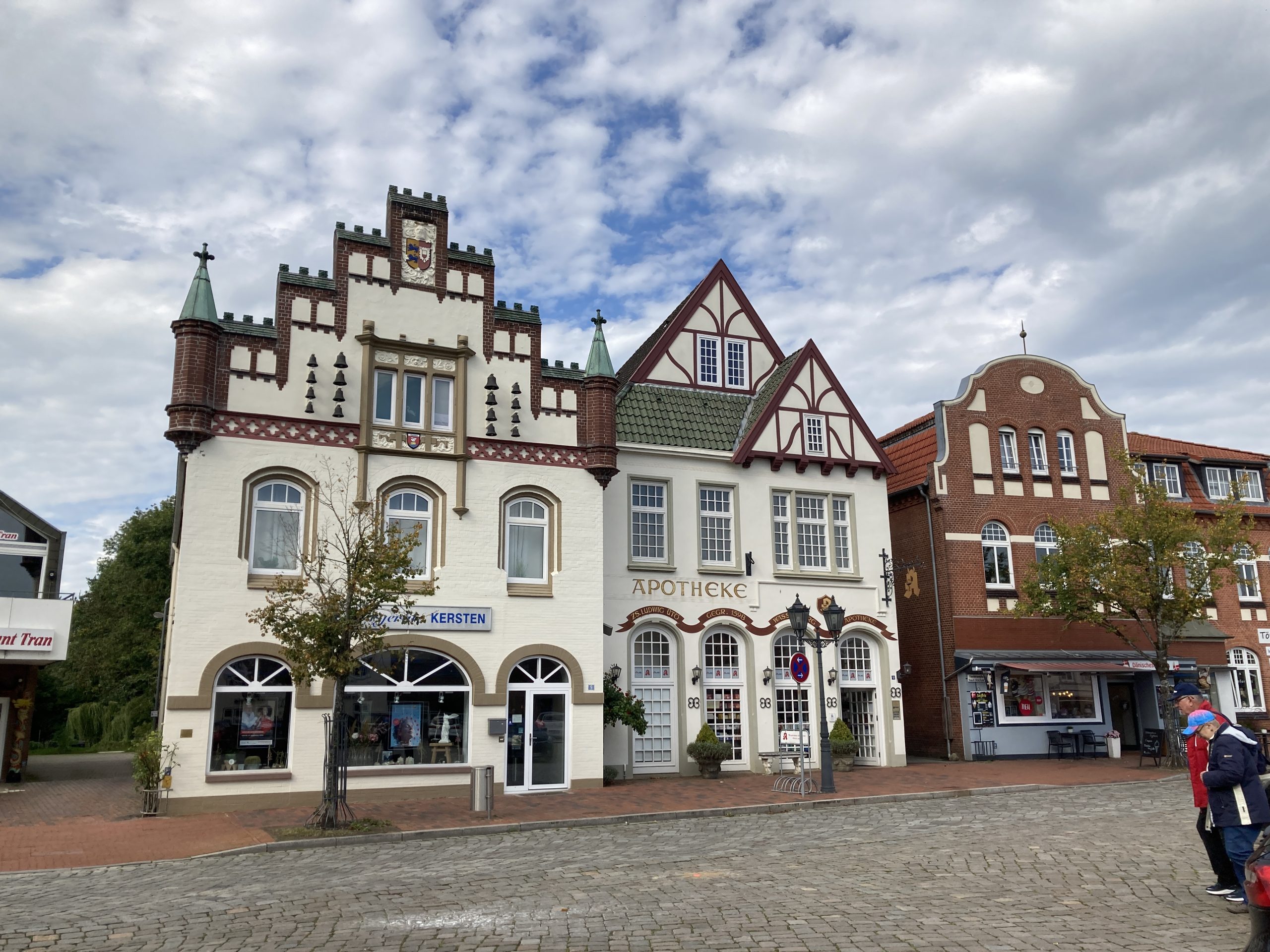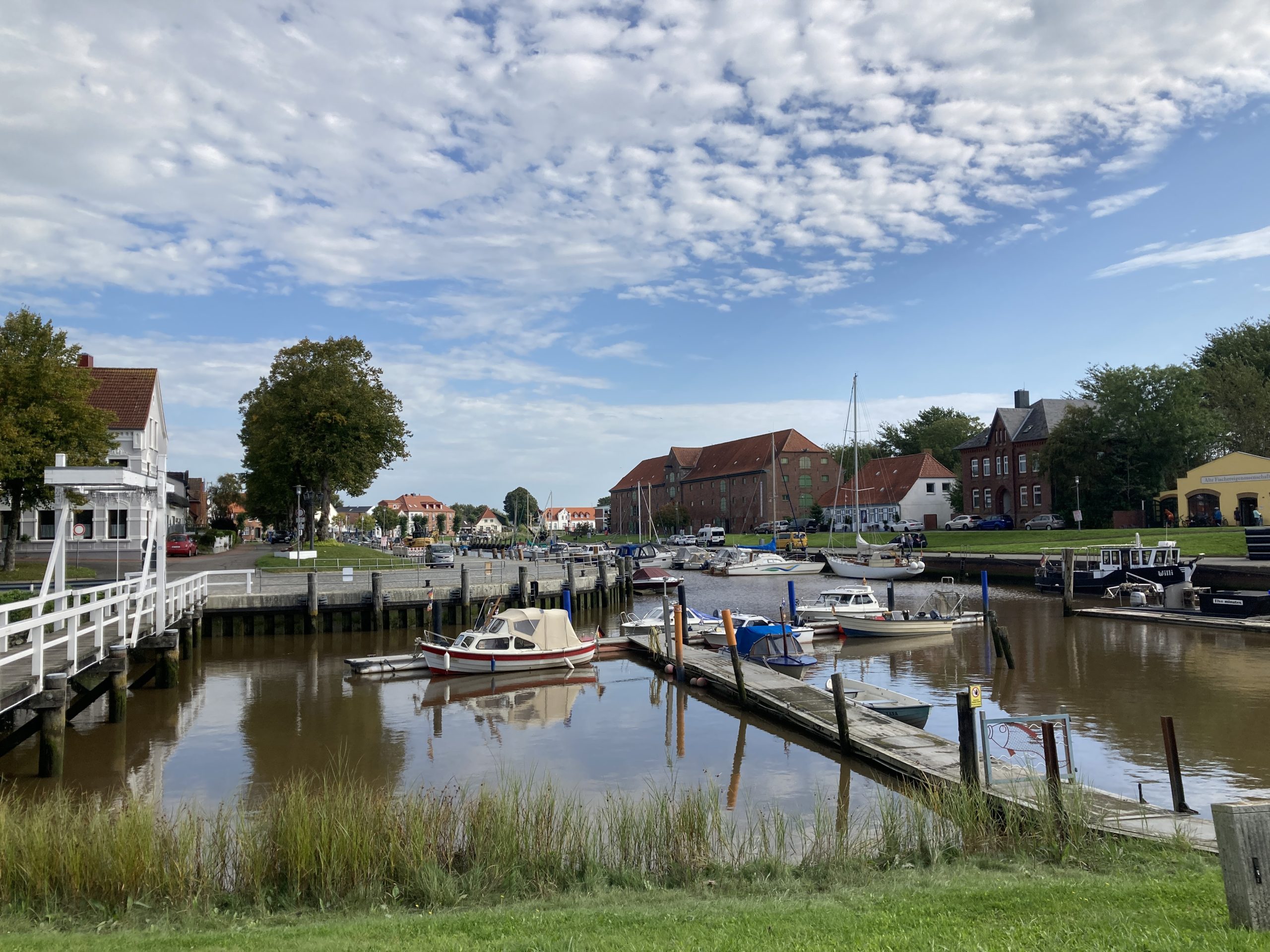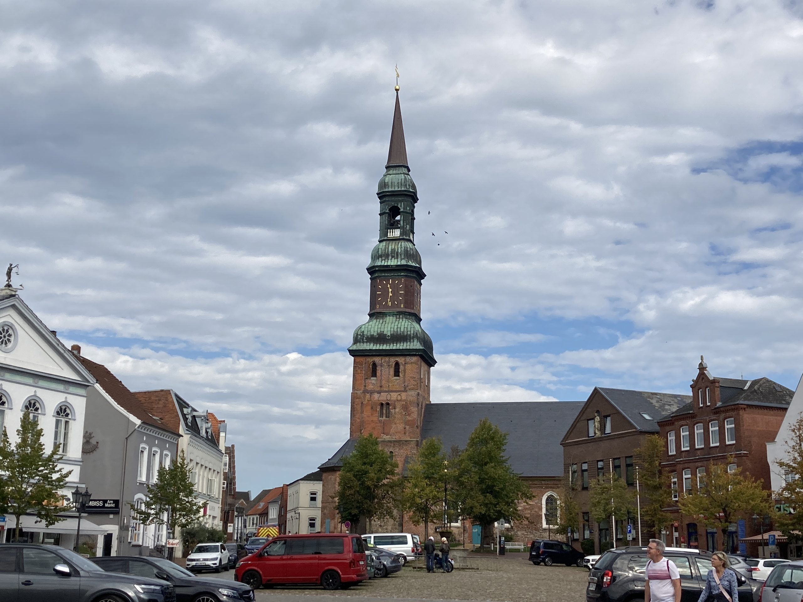 Dann ging es weiter nach Tönning, was ein verschlafenes Hafenstädtchen an der Eider und ein Geheimtipp sein sollte. Nun gut, was im Internet als Geheimtipp gehandelt wird, zieht anscheinend besonders viel Touristen an. Aber es hat einen hübschen Marktplatz, einen netten Schlosspark (ohne Schloss) und einen wirklich reizvollen kleinen Hafen. Über dem Marktplatz wacht die mächtige St. Laurentius-Kirche und dort stehen auch einige wirklich schöne Giebelhäuser.