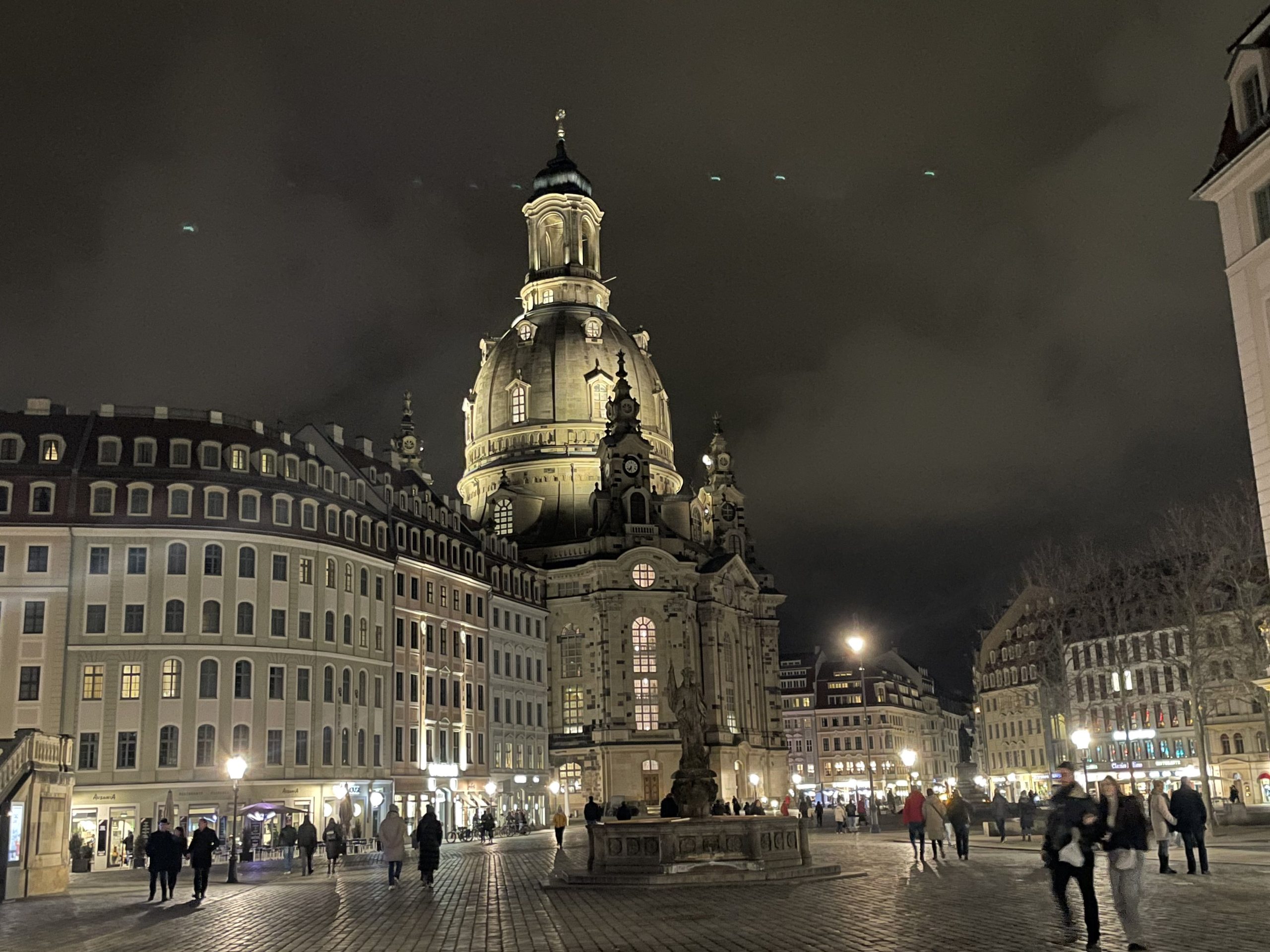 Danach fuhren wir auf die Autobahn Richtung Dresden – knappe 200 Kilometer warteten auf uns. Da erreichte mich die Nachricht vom Hotel, dass mehrere rechte Demonstrationen und entsprechende Gegendemonstrationen aufgrund des 81. Jahrestages der Zerstörung Dresdens erwartet wurden und deshalb die gesamte Altstadt für den Verkehr gesperrt wäre …. wir also unser Hotel nicht mit dem Auto erreichen könnten. Ewald bekam sofort wieder Angstzuständen und sah uns schon in wilde Schlägereien mit rechten Ultras verwickelt, ich war eher der Meinung: Schauen wir uns doch einfach mal an, wie weit wir kommen und entscheiden dann. Nun gut, die gesamte Altstadt war wirklich nicht mit dem Auto zu erreichen plus alle Parkplätze in der Nähe waren gesperrt. Aber die Straßenbahn fuhr!!! Wir parkten also auf einem Parkplatz weitab vom Schuss und wollten Straßenbahn fahren. Aber zuerst mussten wir den natürlich nur mit App zu bedienenden Parkautomaten uns gefügig machen – und es war natürlich nicht die App, die wir letzte Woche gerade für Wiesbaden heruntergeladen hatten!!!Also im inzwischen aufgekommenen Schneeregen erst einmal die App runterladen, dann die ganzen Gelddinge eingeben… ich weiß, ich weiß: der erfahrene Handy-Benutzer macht das so zwischen Tür und Angel – aber wir nicht. Wir brauchen unsere Zeit – auch im Schneeregen. Unter Ewalds beruhigendem Zureden schaffte ich es schließlich – wir schrammten wieder einmal kurz an der Ehescheidung vorbei! Ich bin in solchen Situationen wirklich kaum zu ertragen! Wir bepackten uns mit allem, was unbedingt nötig war – und das war ziemlich viel. Der Weg zur Straßenbahn war nur kurz, aber dann standen wir dem Fahrschein-Automaten gegenüber, dessen Scheibe blind blieb und uns wirklich keine Möglichkeit bot, einen Fahrschein zu erstehen. Der junge Mann, der uns interessiert musterte, meinte sehr hilfreich: für die drei Stationen würde sich ein Fahrschein sowieso nicht lohnen und außerdem käme die Straßenbahn gerade. So fuhren wir schwarz! Wir, also vor allem Ewald, der ja nicht einmal das Finanzamt betrügt, fuhren drei Stationen weit ohne Fahrschein!!!! Es war ein Tag der Unglaublichkeiten. Leider drehten unsere Hunde in der Straßenbahn ziemlich durch, schließlich waren sie so was ja überhaupt nicht gewöhnt. Und wir waren zwischen Koffern, Rucksäcken und Tüten auch leider nicht in der Lage uns ihnen entsprechend zu zuwenden. Nun ja, frei nach Tucholsky: Unsere Hunde machen keinen Lärm, sie bellen nur, überstanden wir, freundlich-entschuldigend nach allen Seiten lächelnd, auch diese Situation. Aber wir fanden schnell das Hotel, bekamen ein wunderschönes, großes Apartment und konnten uns dann erst einmal mit einen kleinen Schläfchen stärken. Gut drei Stunden später beschlossen wir, jetzt das Auto zu holen, auszupacken und dann wieder auf den Parkplatz zurück zu bringen; es war schon dunkel und die Sperrung bestimmt aufgehoben. Wieder an der Straßenbahn erklärte uns ein freundliches Ehepaar diesmal den Computer, den man durch ein einfaches doppeltes Drauf-Tippen zum Arbeiten bringt. Erstaunlicherweise genauso wie unsere Handys! Aber wir nahmen gleich eine 10er-Karte, um von dem Teil wirklich nicht mehr abhängig zu sein. Die Hunde wurden auf den Schoss genommen und so waren sie bereit, auch die Straßenbahn zu ertragen. Aber die Stimmung in der Straßenbahn war seltsam, es war sehr viel gelb-schwarz zu sehen und Ewald erklärte mir, dass Dynamo Dresden heute Abend spielen würde. So weit für mich kein Problem! Schwierig wurde es erst, als die gesamte Straßenbahn mit uns zusammen ausstieg und sich Richtung Parkplatz mit uns auf den Weg machte. Unser Parkplatz war leider zum Stadion gehörig und deswegen zu diesem Zeitpunkt schon völlig überfüllt.Uns wurde klar: Wenn wir jetzt unsere Auto wegfahren, bekommen wir hier in der Gegend nie wieder einen Parkplatz, also zumindest nicht am heutigen Abend. Also, wir packten die restlichen Sachen zusammen, ließen unser Auto, wo es war, und nahmen wieder die Straßenbahn zum Hotel. Ein Glück, dass wir genügend Fahrscheine hatten! Danach war es schon 20 Uhr und wir so fertig, dass wir nicht einmal mehr Essen gehen konnten. Glücklicherweise hatten wir genügend Brot und Belag für die Frühstücke dabei und vor allem …… eine Flasche Frexeneit. Wenn nichts mehr hilft, rettet die einen zumindest noch bis zum Bett. Das war ein Tag!!!!