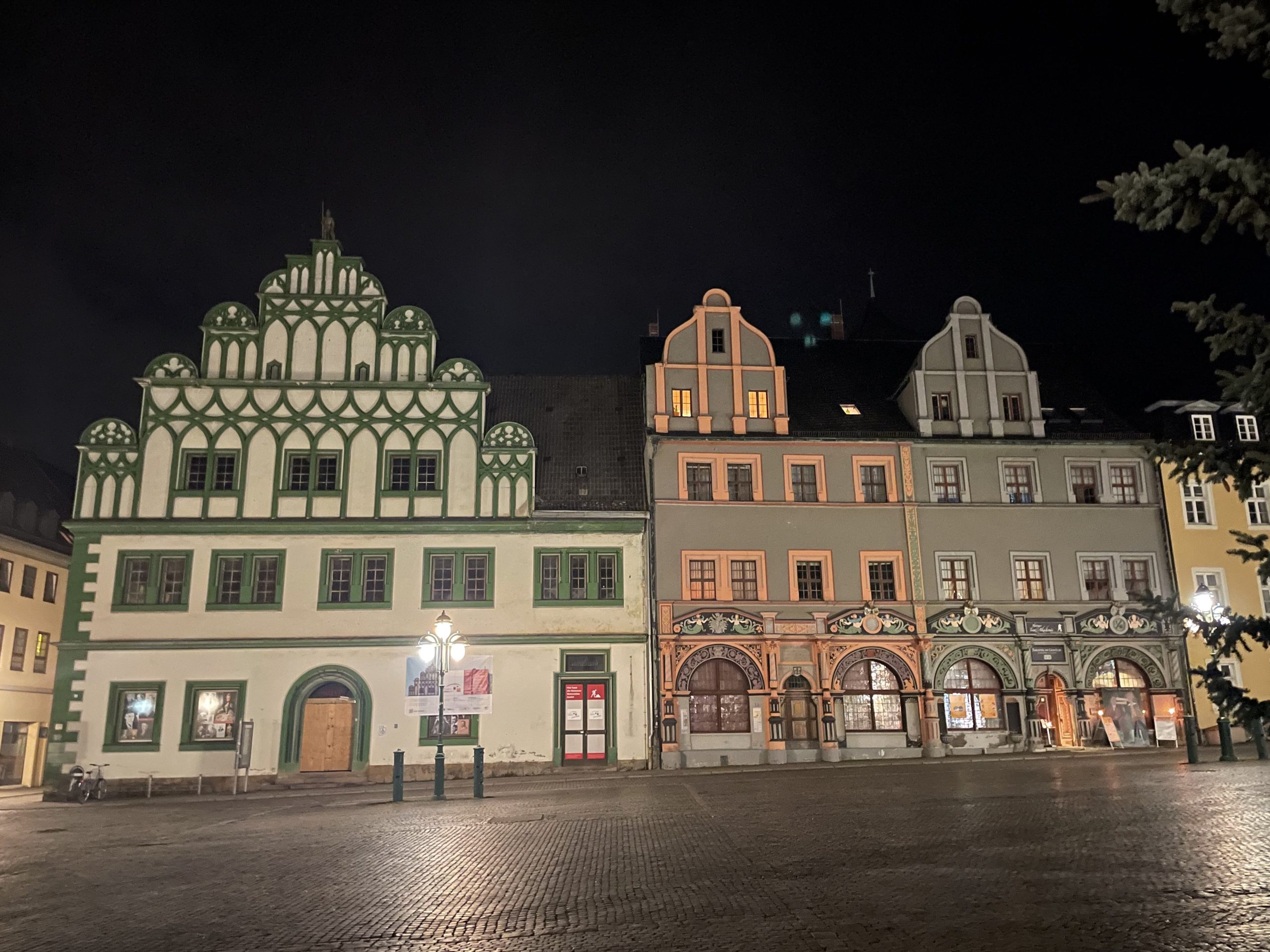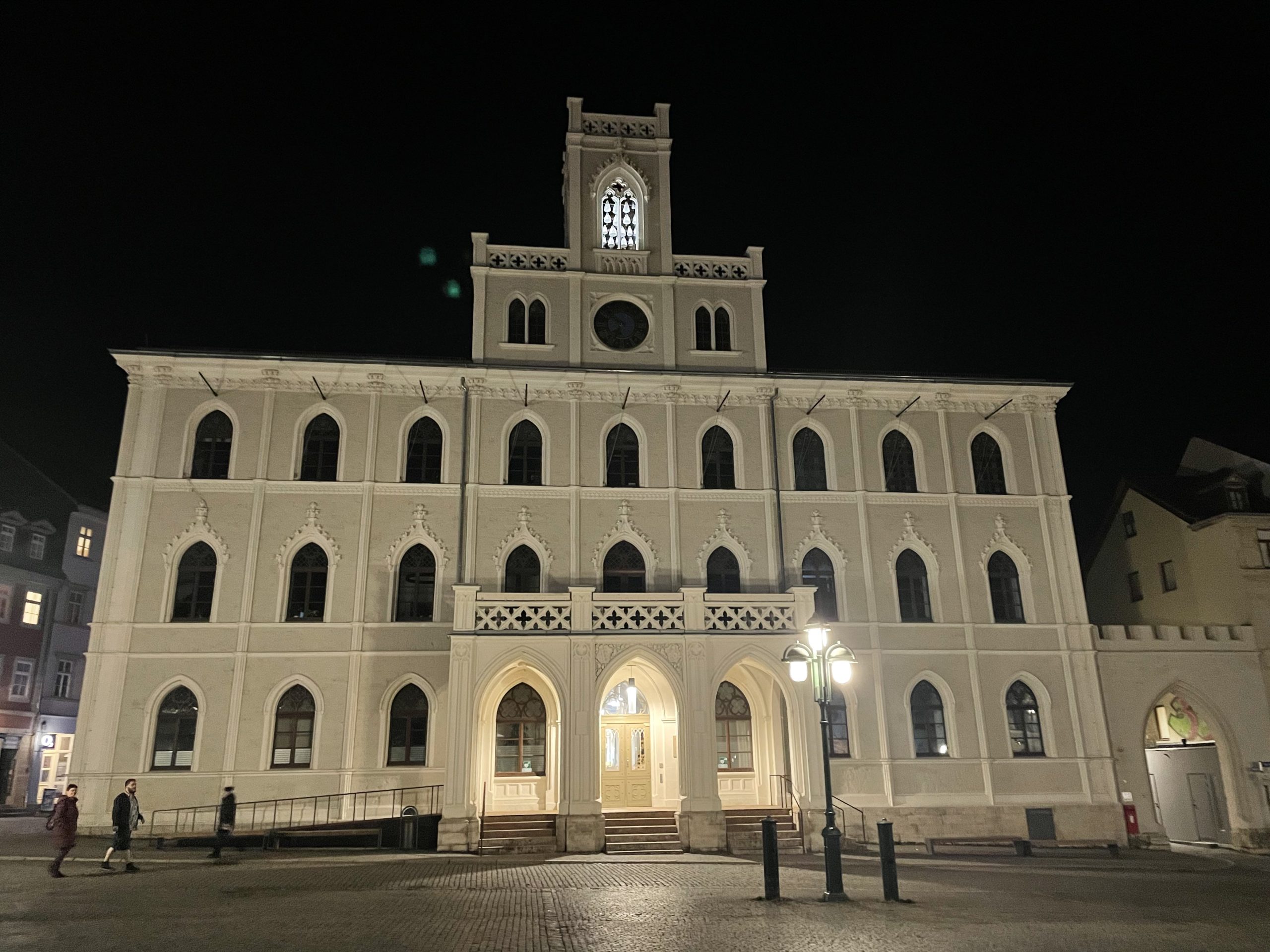 Mir war beim Buchen ein Hotel aufgefallen: Konsumhotel Dorotheenhof, Doppelzimmer mit Frühstück für 65 Euro. Na, das lässt man sich doch gefallen, auch wenn es etwas außerhalb liegt. Aber als wir es anfuhren, was es uns doch etwas seltsam: die Straße war gepflastert und machte den Anschein, dass seit 300 Jahren kein Mensch mehr was dran gemacht hat. Um uns herum nur Felder, also irgendwie etwas unwirtlich, aber so sieht es ja im Februar meist überall aus. Das Hotel hat uns jedoch aufs positivste überrascht: Freundlicher, schneller Service beim Einchecken, ein riesiges, geschmackvolles Zimmer mit begehbarem Kleiderschrank und Decke und Trinknapf für unsere Mädchen und ein Frühstück vom Feinsten – alles da, was ein Mensch sich denken kann, sogar Honig aus der eigenen Imkerei. Ein netter, kleiner Park rund um das Hotel, viele Parkplätze, einfach alles super. Nach einem kurzen Erholungsschläfchen machten wir uns auf den Weg nach Weimar. Obwohl das Hotel so aussah, als wäre es am Ende der Welt, waren es mal genau 4 Kilometer bis Weimar. Es war schon dunkel, wir fanden problemlos einen Parkplatz und spazierten dann durch kleine Gässchen mit schönen Häusern bis zum Marktplatz, der uns mit dem Rathaus sehr gut gefiel. Dort am Marktplatz fanden wir auch ein schönes spanisches Restaurant, das uns vom Stil her sehr an unsere Zeit in Barcelona erinnerte. Und es gab einen überaus leckeren Tapas-Teller und für mich noch Datteln im Speckmantel und dazu guten Wein – der Tag war perfekt!