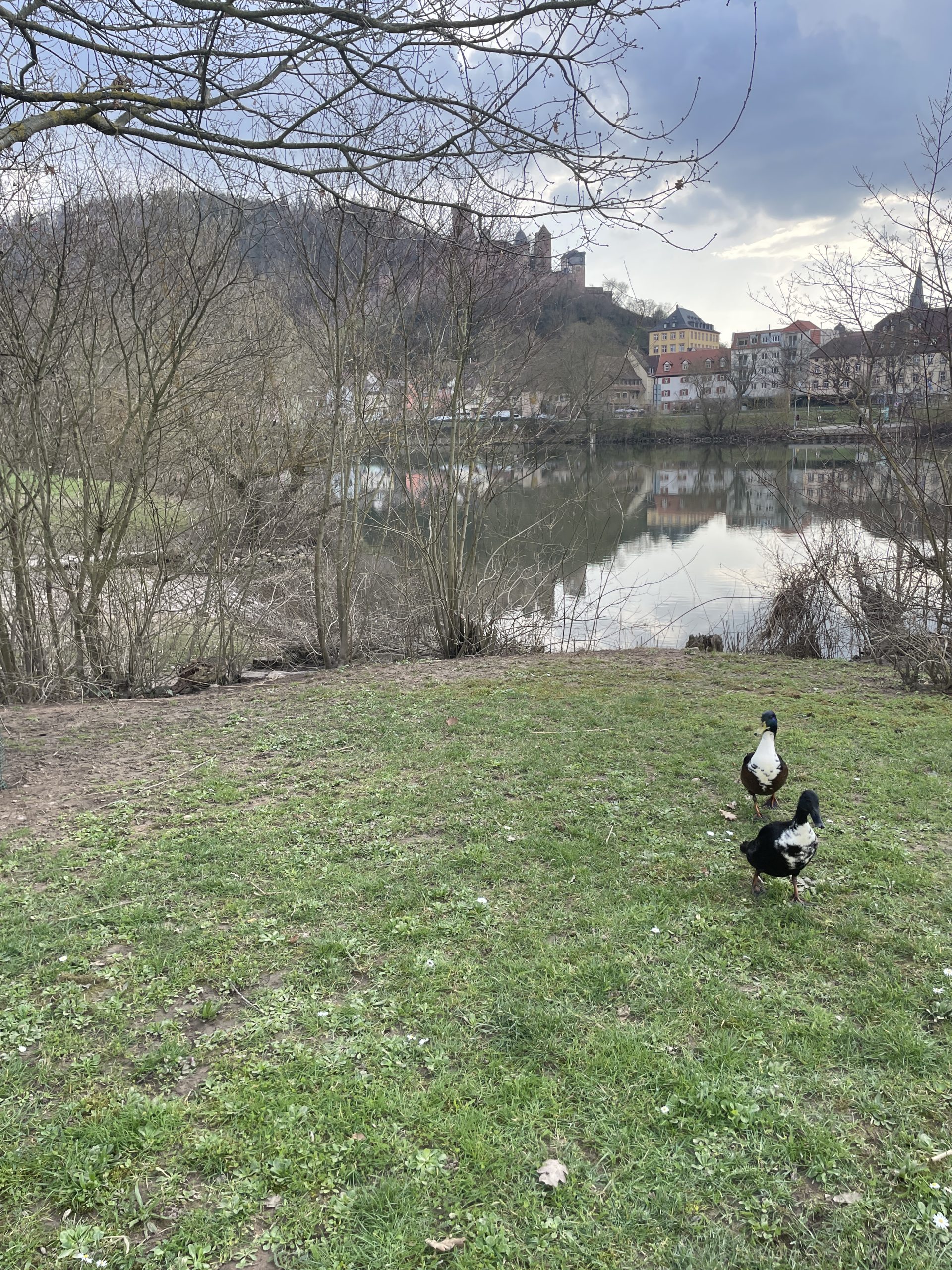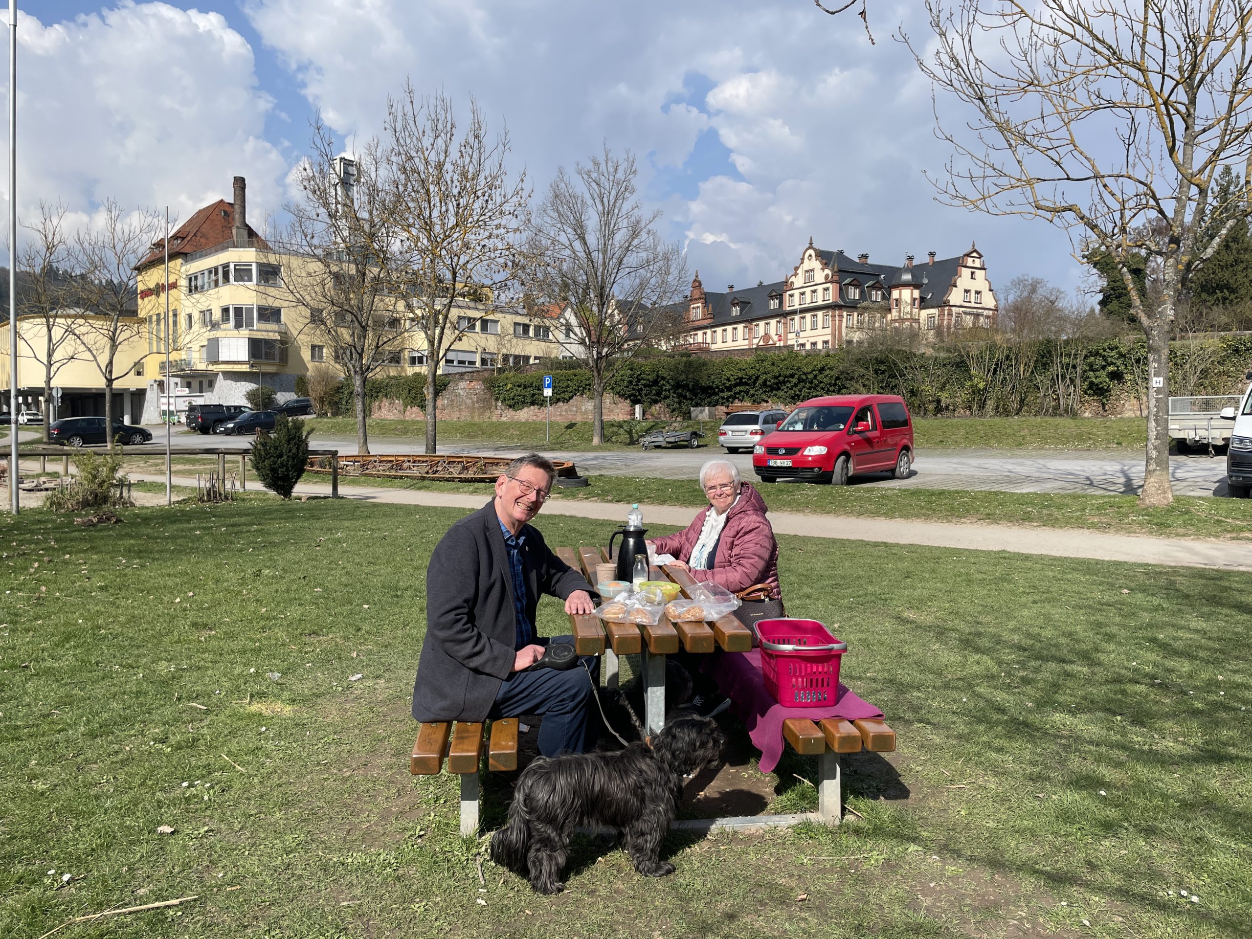 Nach einer ruhigen Fahrt auf der Autobahn fuhren wir bei Kreuzwertheim ab und hinunter an den Main. Am Mainufer fanden wir einen schönen Picknickplatz und ließen es uns mit Brötchen und gekochten Eiern (die mussten schon bei meiner Mutter bei jedem Ausflug dabei sein!) im Sonnenschein gut gehen. Der schöne Anblick von Schloss Wertheim am anderen Ufer erfreute uns und zwei schwarz-weiße Enten leisteten uns Gesellschaft. Sie hofften wohl auf den einen oder anderen Bissen, der von unserem Tisch abfallen würde, aber das konnten Lucy und Jasmin auf keinen Fall durchgehen lassen. Was runter fiel, gehörte ihnen!